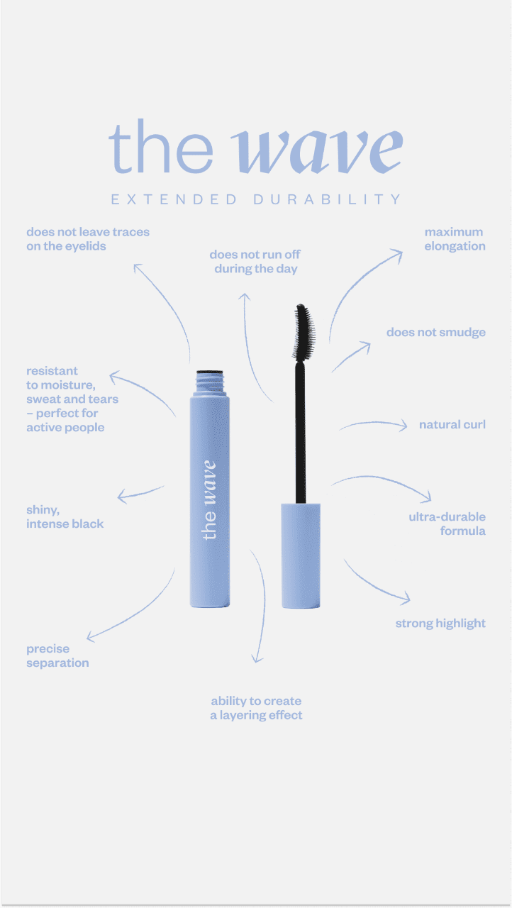 Ingrédients THE WAVE : Aqua, CI 77499, Cire d’abeille synthétique, Copernicia Cerifera Cera, Isododécane, Triméthylsiloxysilicate, Polypropylsilsesquioxane, Acrylates/Acrylate d’éthylhexyle/Copolymère Hema, Polyuréthane-35, Aminométhyl Propanol, Hydroxyéthylcellulose, Acrylates/Diéthylaminomère